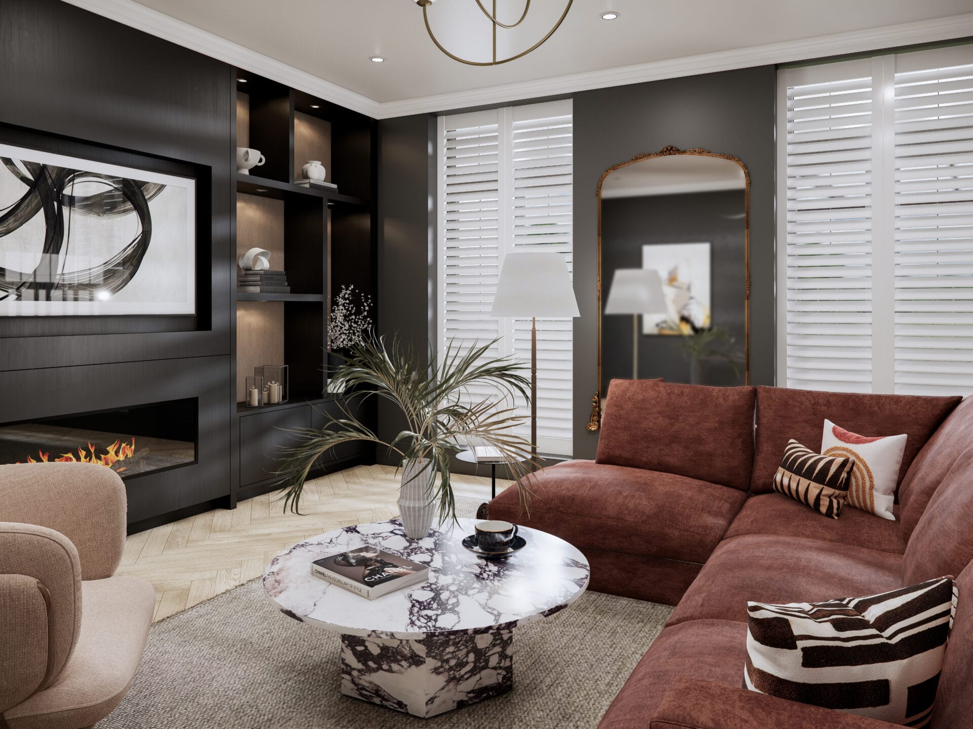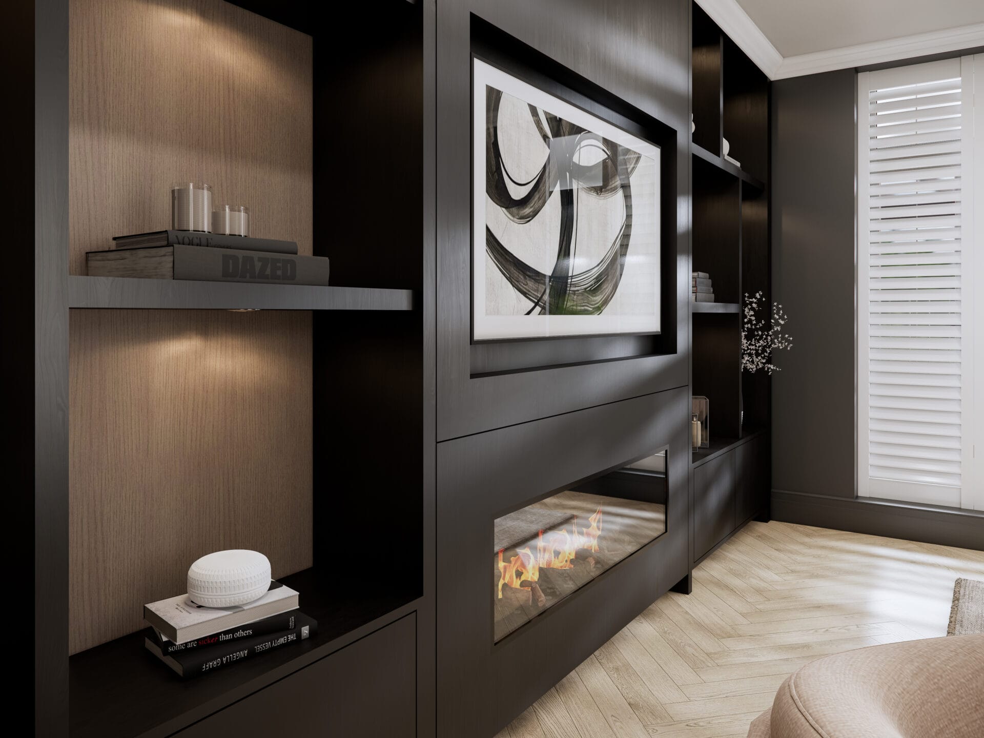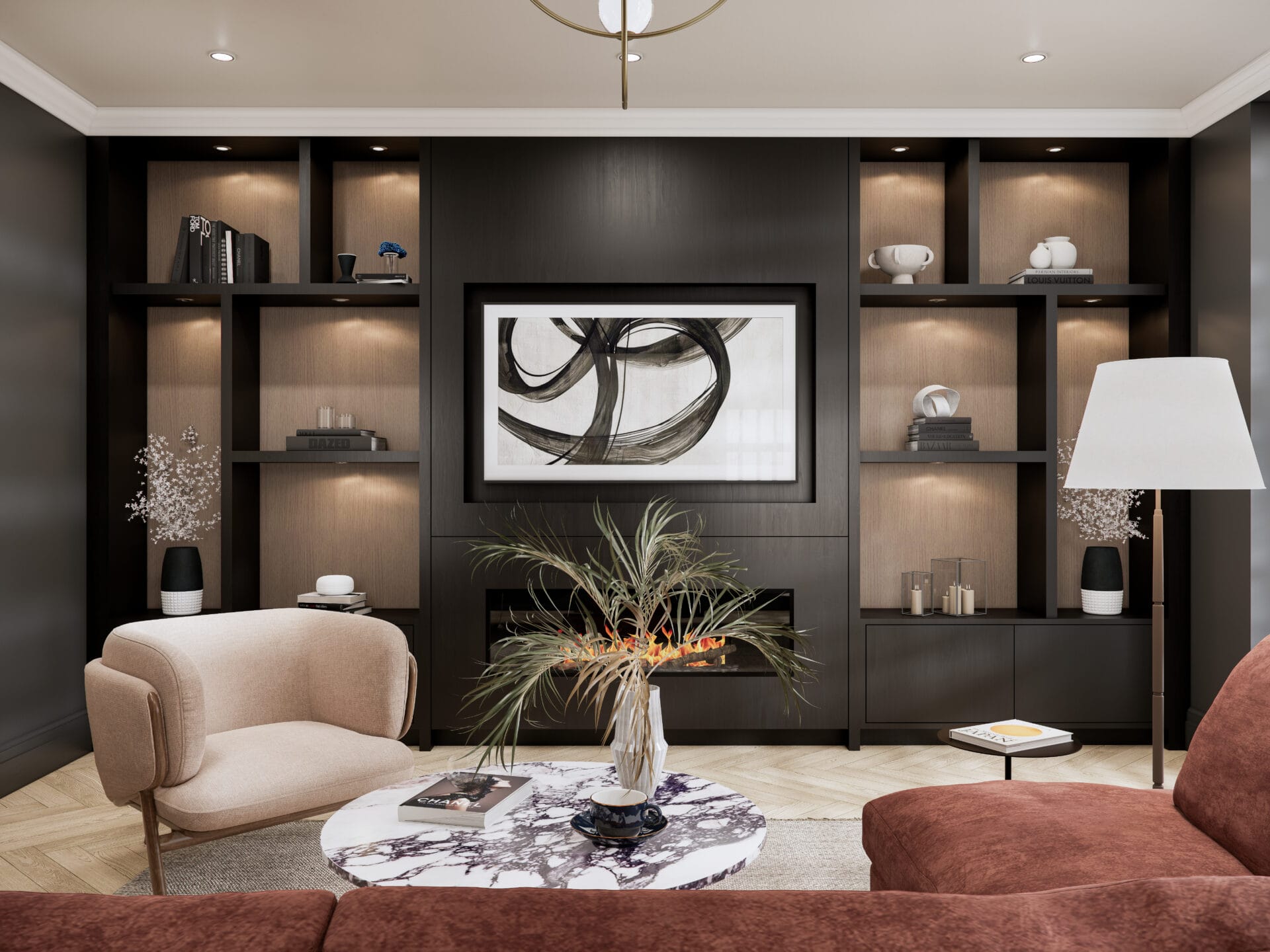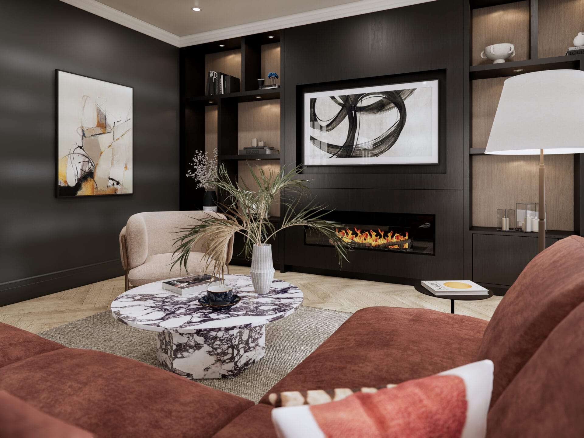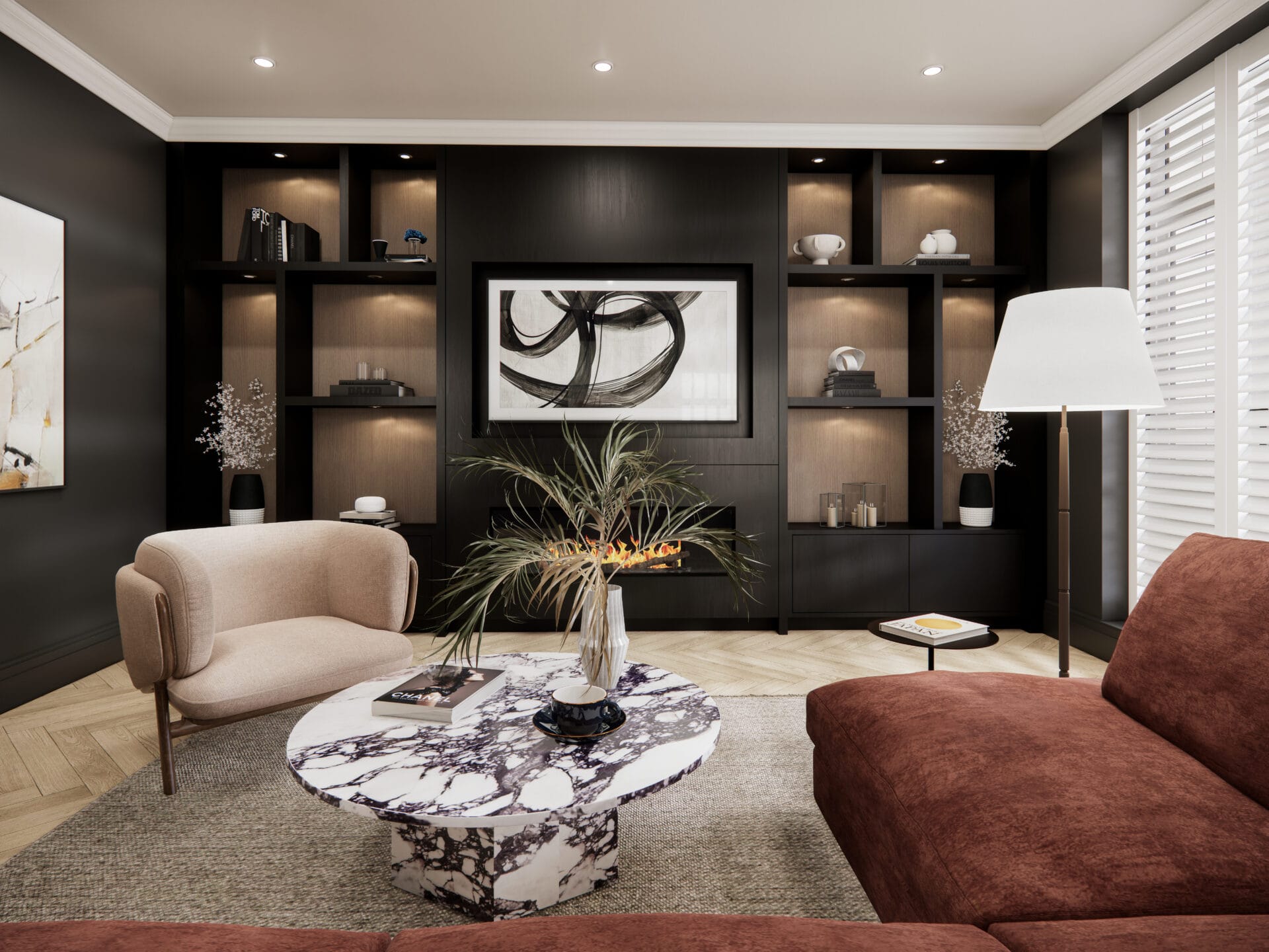 Set within a classic townhouse in Beckenham, this living room was reimagined to create a space that feels both elevated and inviting. The design blends deep, moody tones with warm textures to balance sophistication and comfort. A bespoke media wall anchors the room, featuring integrated shelving with soft accent lighting and a contemporary linear fireplace that adds warmth and focus.