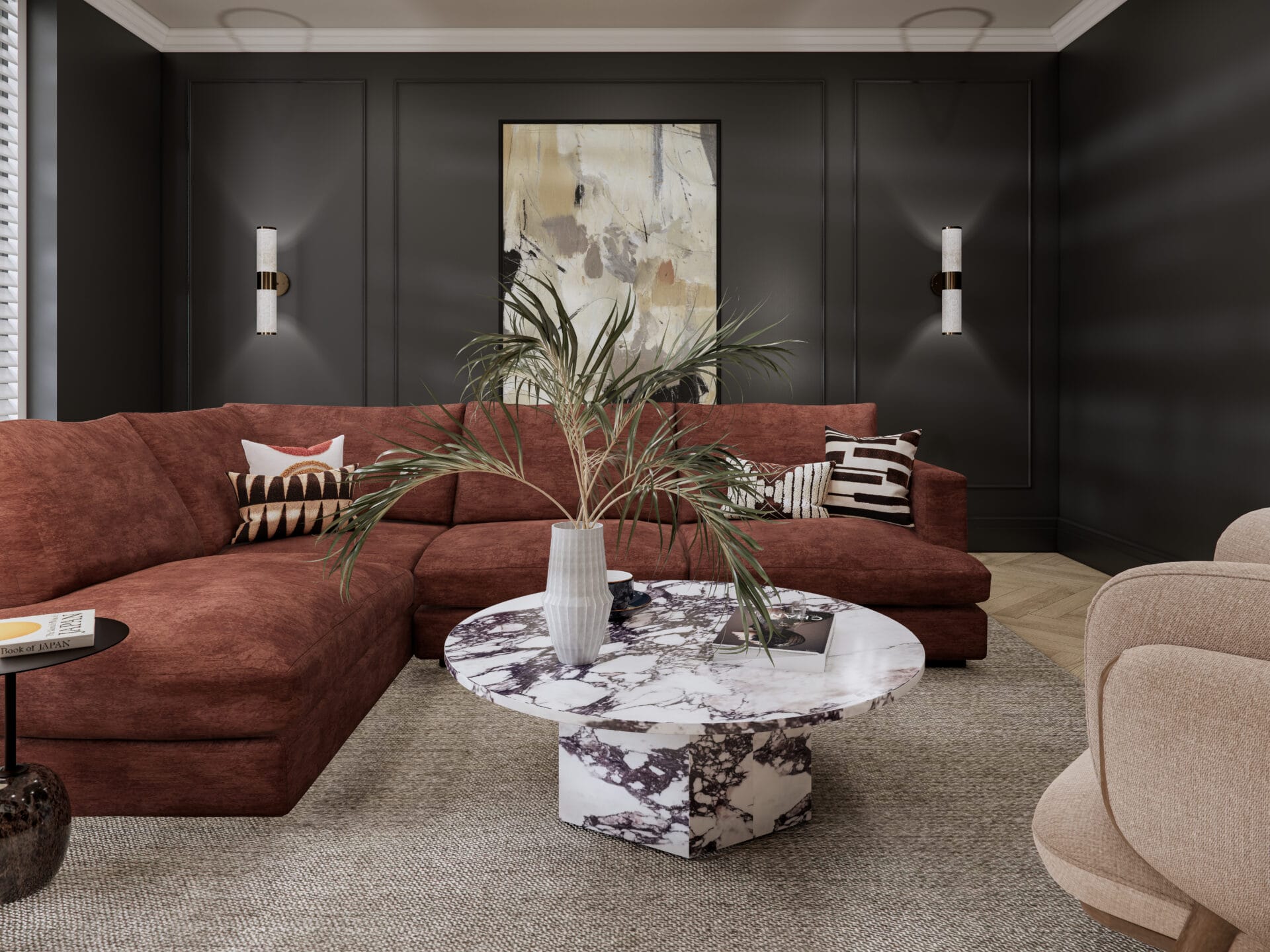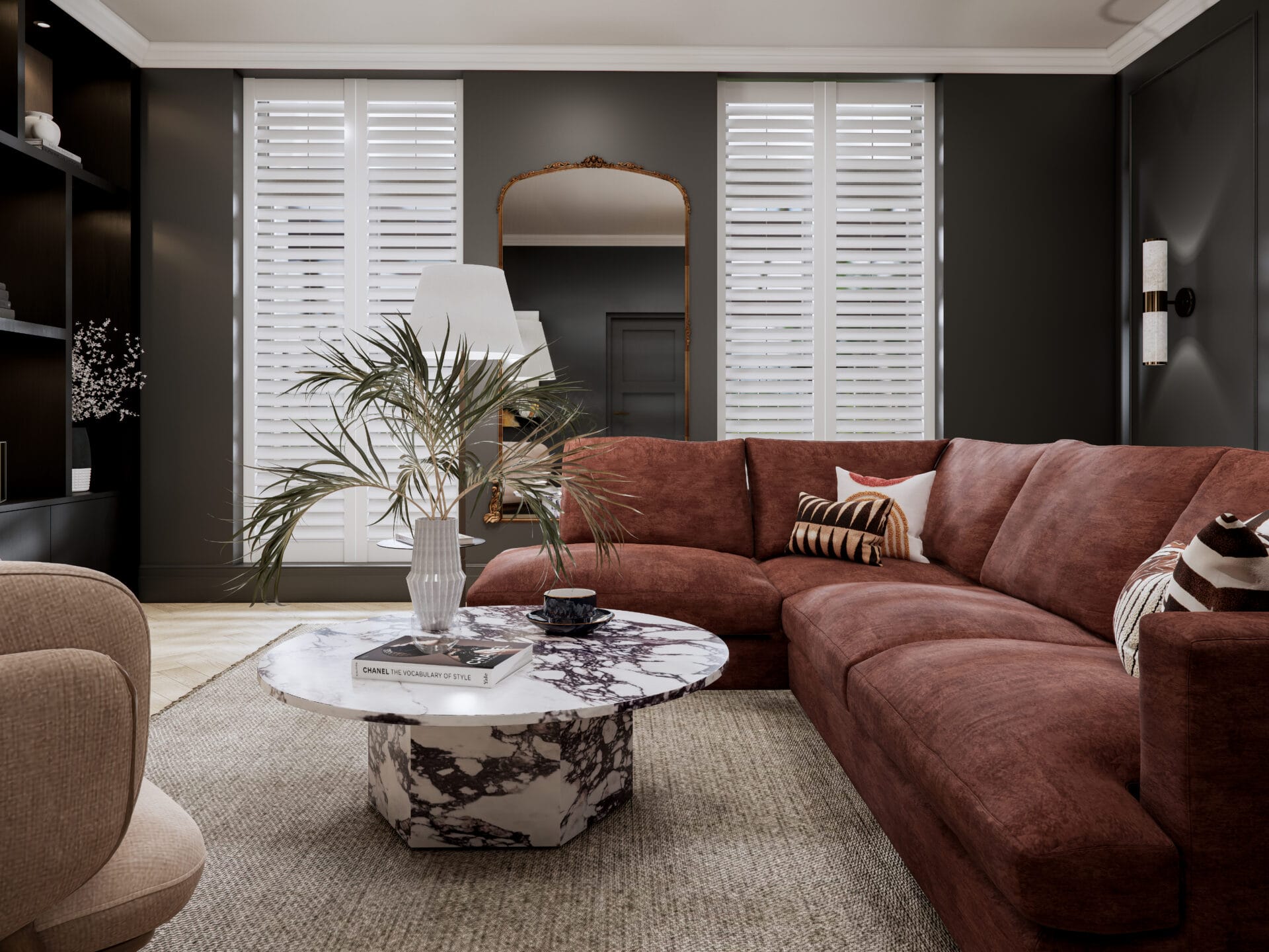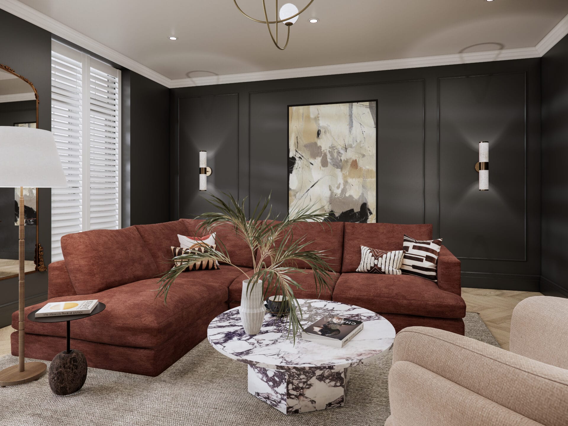 Layered lighting, tactile fabrics and a curated mix of furniture pieces complete the space, from the rich rust colour sofa to the sculptural armchair and brass details throughout. The result is a refined yet relaxed environment that feels timeless, personal and perfectly suited to modern townhouse living.