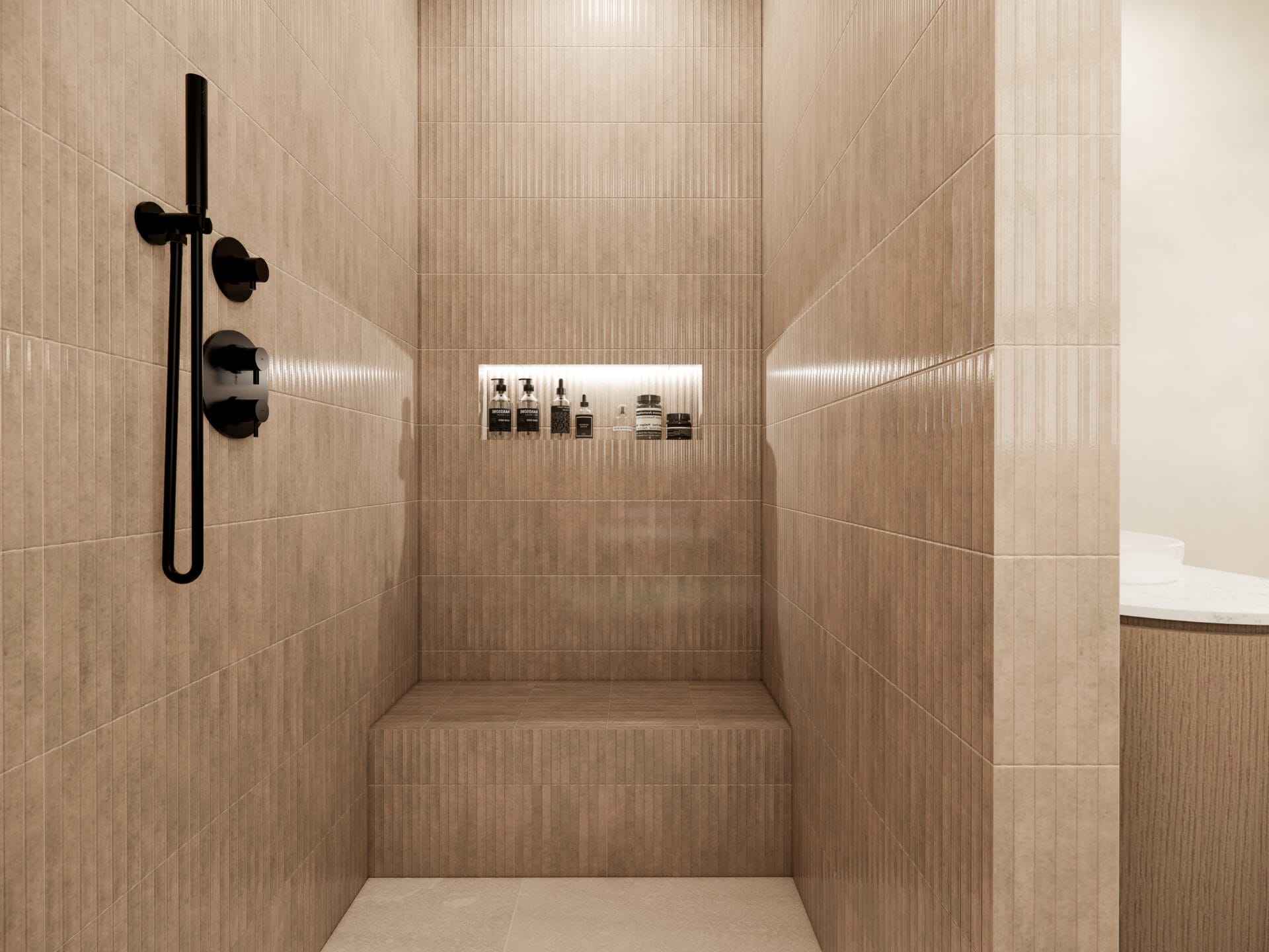 In the walk-in shower, linear tiles wrap around the walls to enhance the sense of height and continuity. Every detail was considered to create a space that feels serene and understated, yet quietly luxurious — a private retreat within the home.