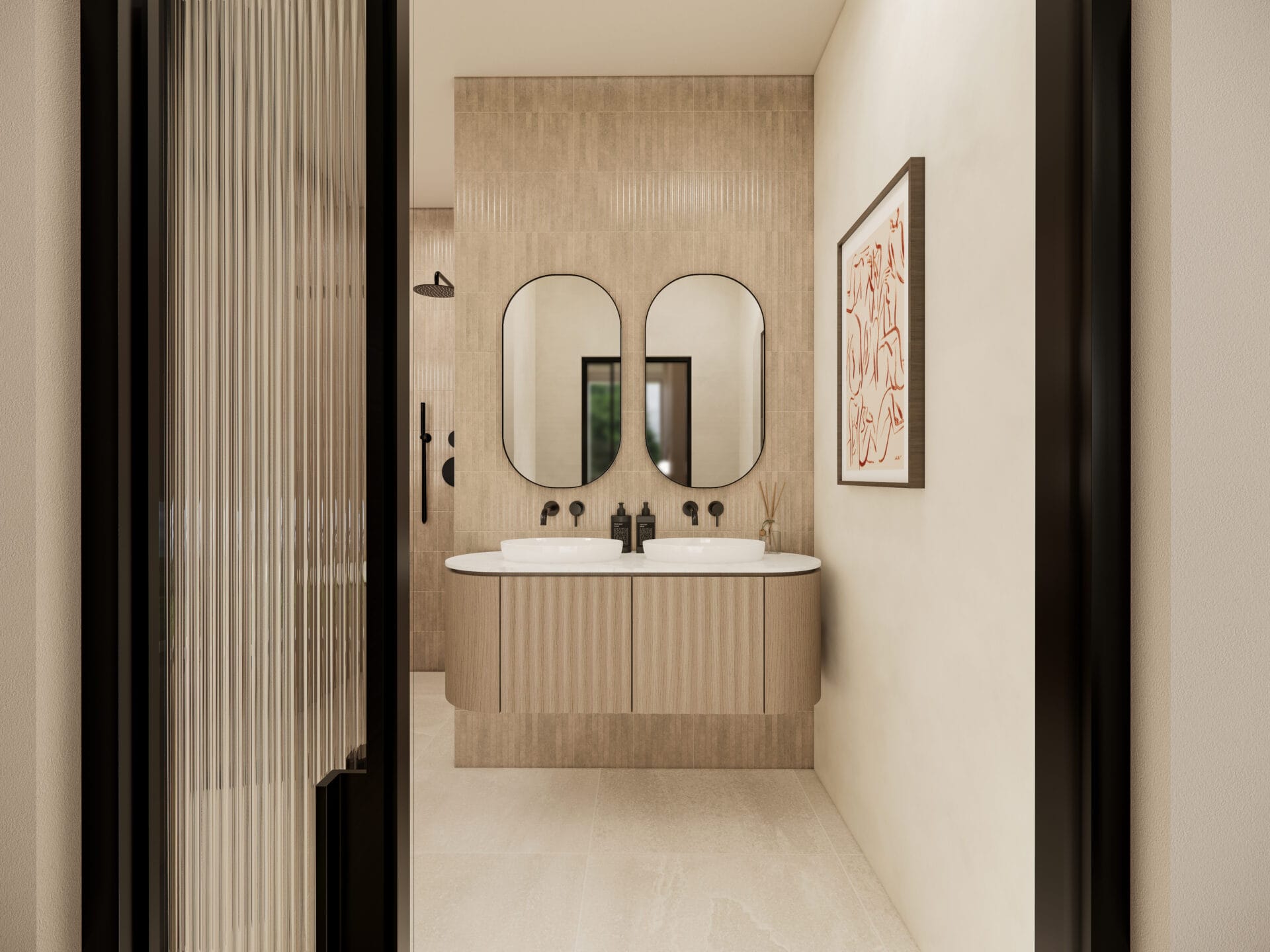 This ensuite bathroom was designed to feel calm, refined and beautifully simple. A soft neutral palette creates a sense of warmth and balance, while clean lines and subtle textures add depth and interest. The double vanity in fluted oak tones brings a natural touch, paired with curved mirrors and matte black fittings for a modern contrast.