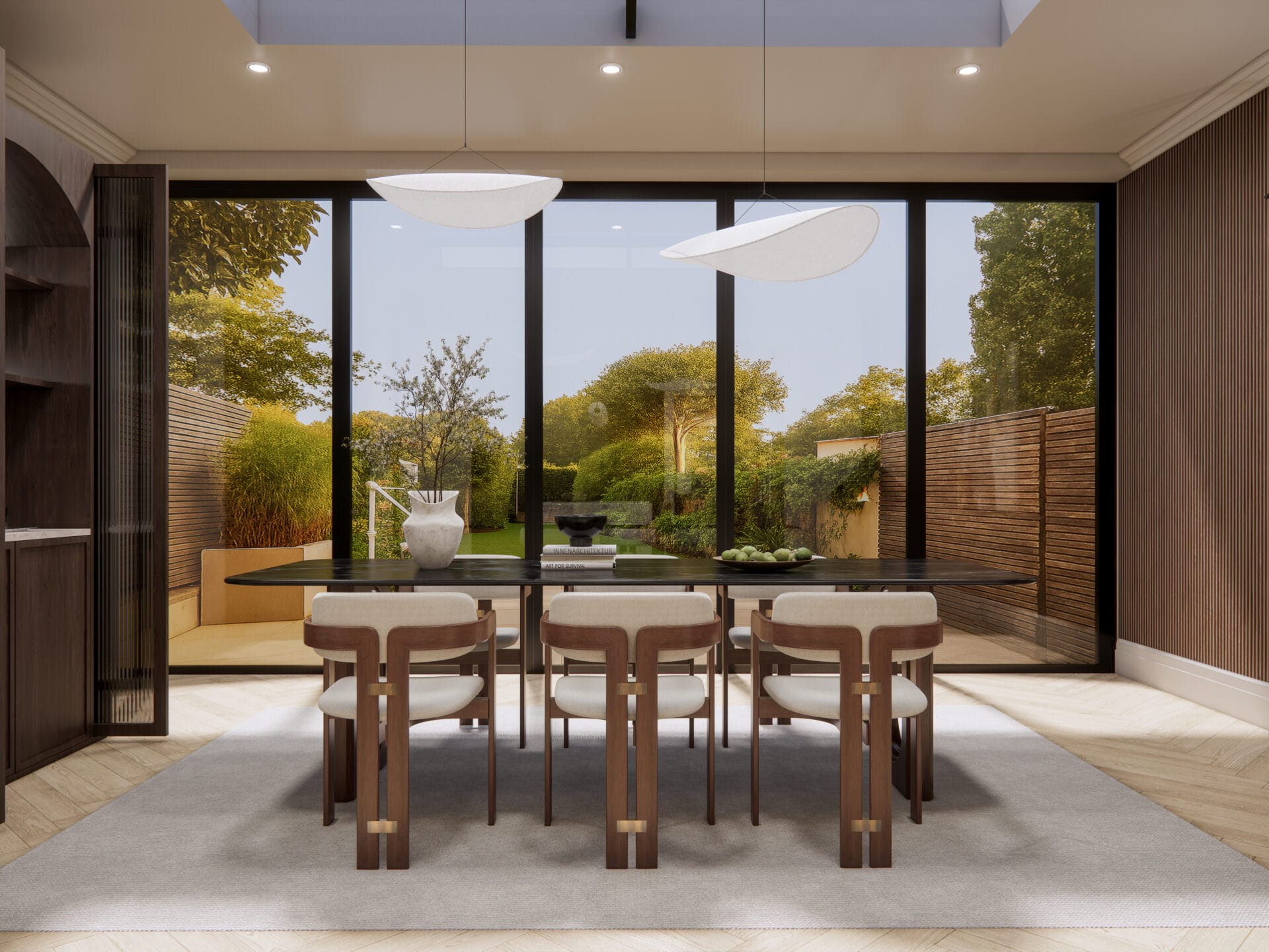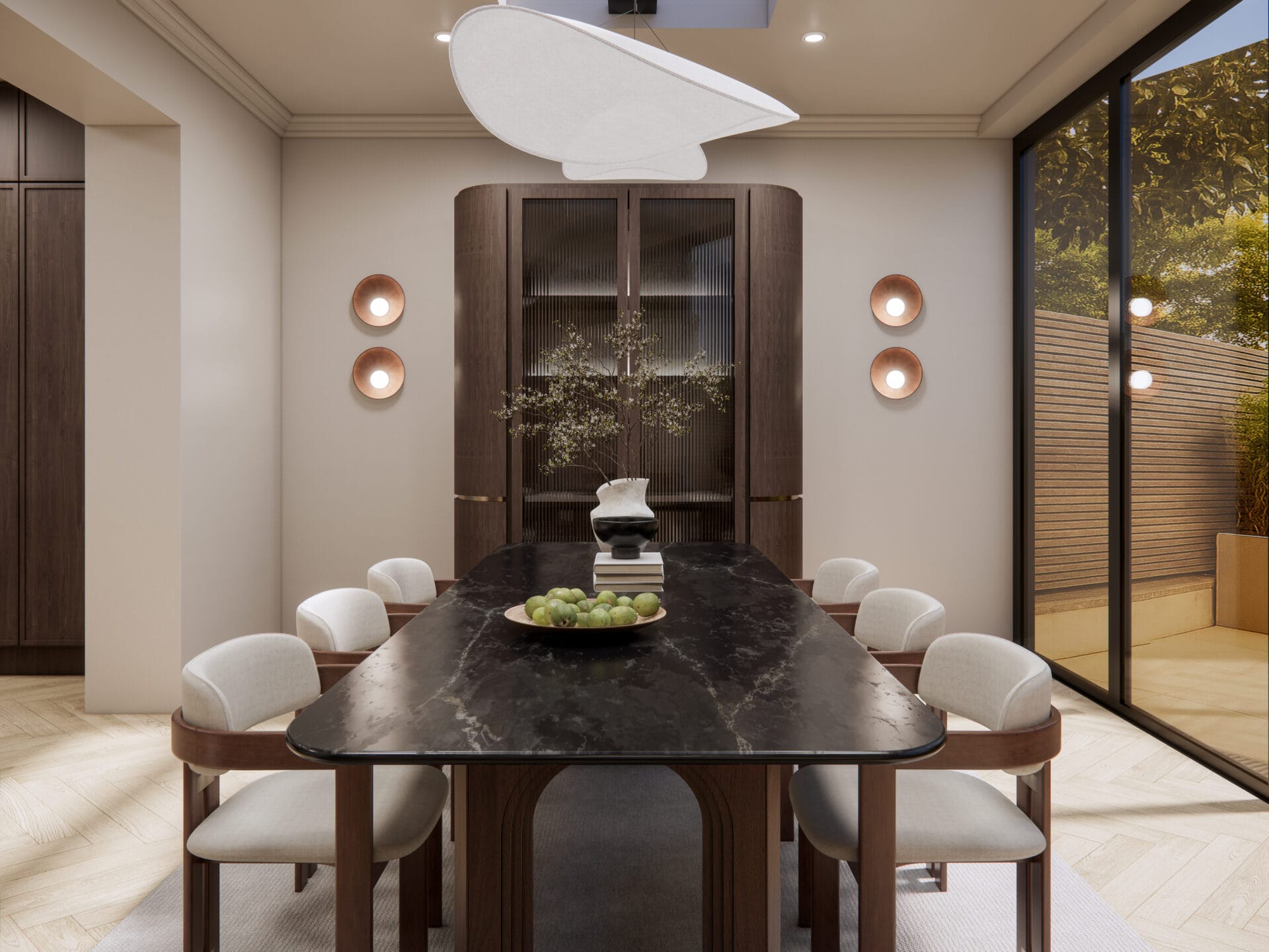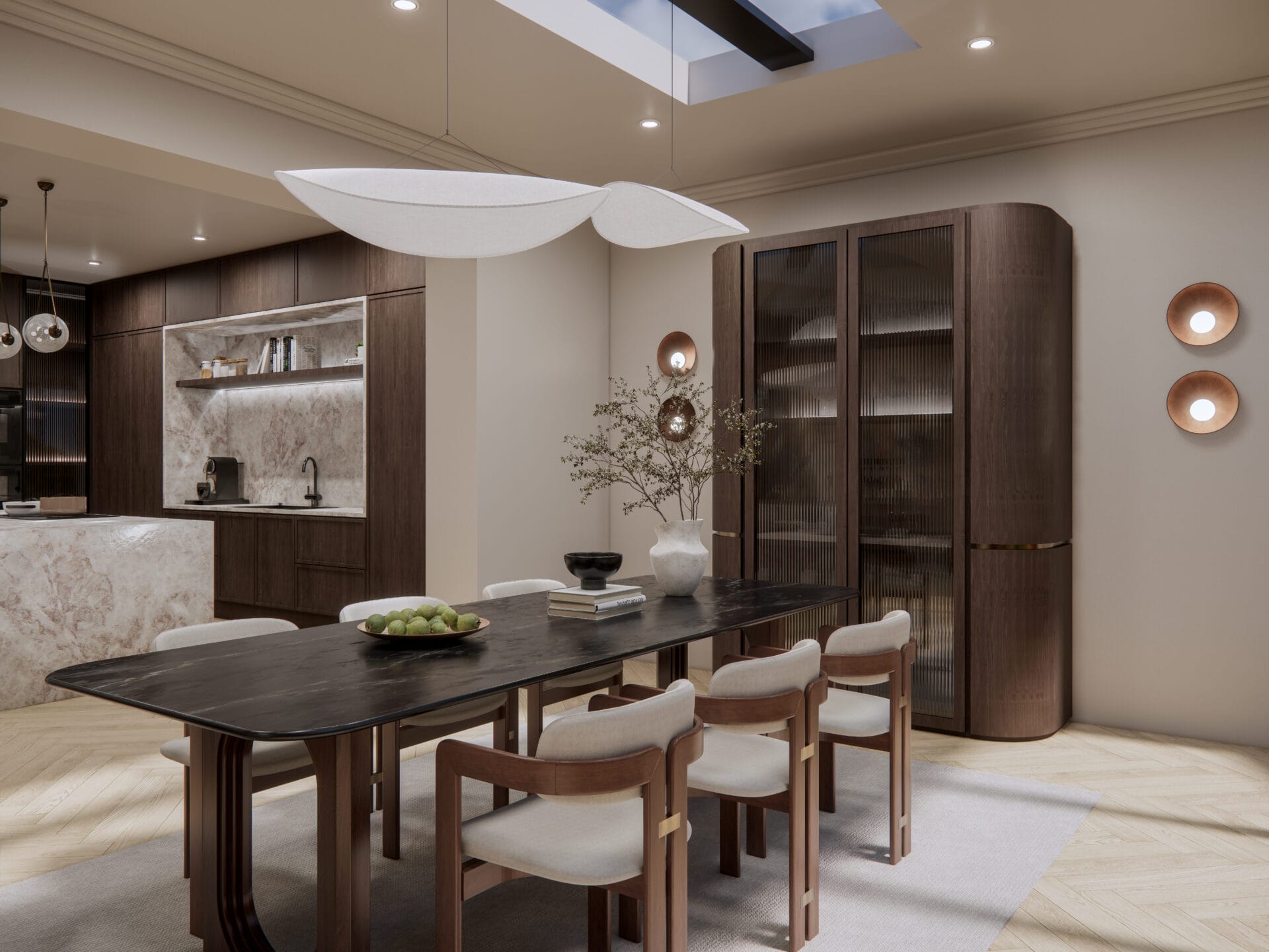 For this Beckenham townhouse, we designed a warm yet contemporary open-plan kitchen and dining space that balances elegance with functionality. The layout connects the dining area seamlessly with the kitchen, creating a social hub at the heart of the home.