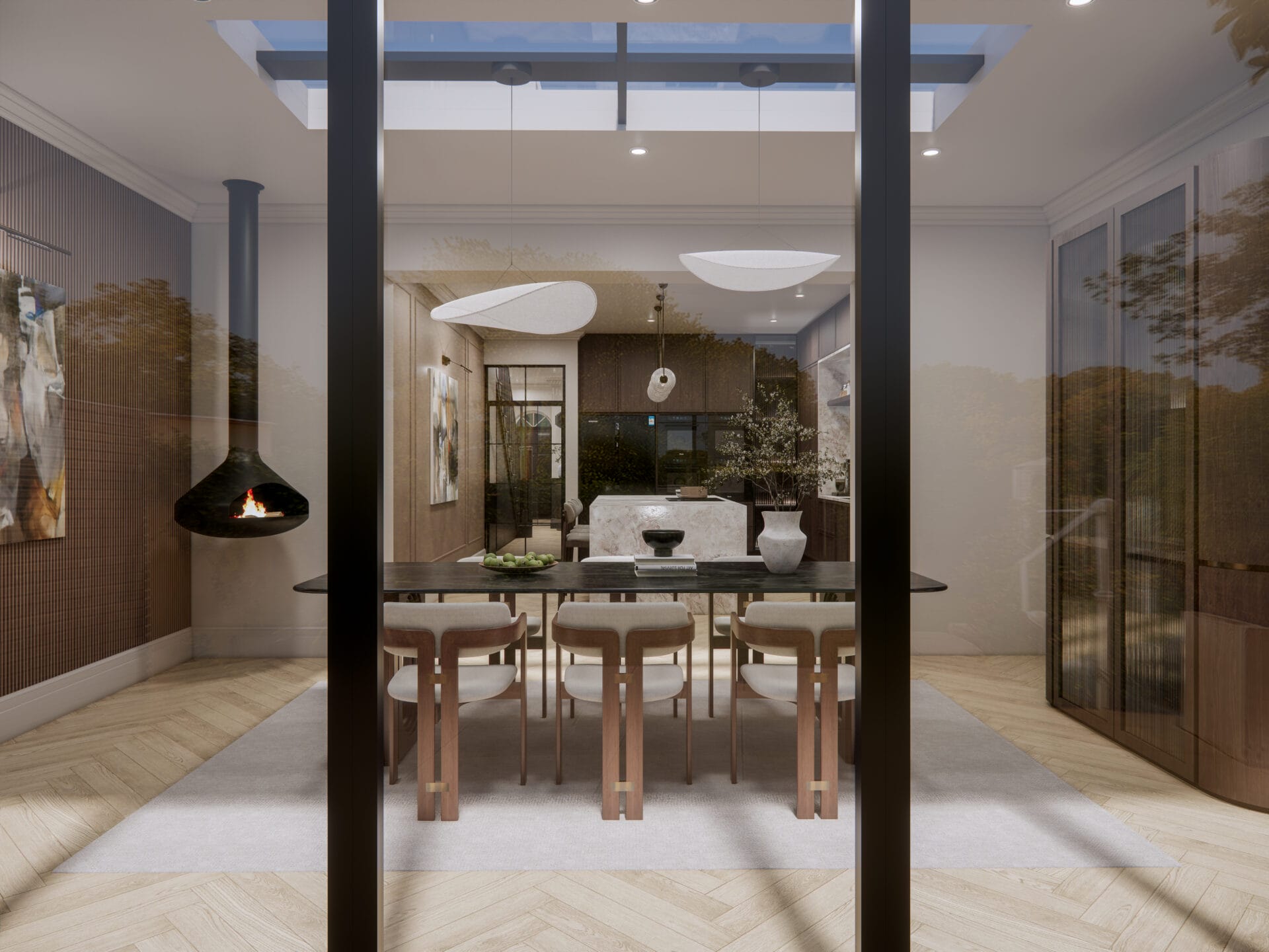 A black stone dining table sits at the centre of the scheme, paired with solid wood dining chairs upholstered in a soft neutral fabric to achieve both comfort and refinement. Overhead, sculptural pendant lights add a sense of movement and modern artistry, while a suspended fireplace introduces a striking focal point and touch of cosiness.