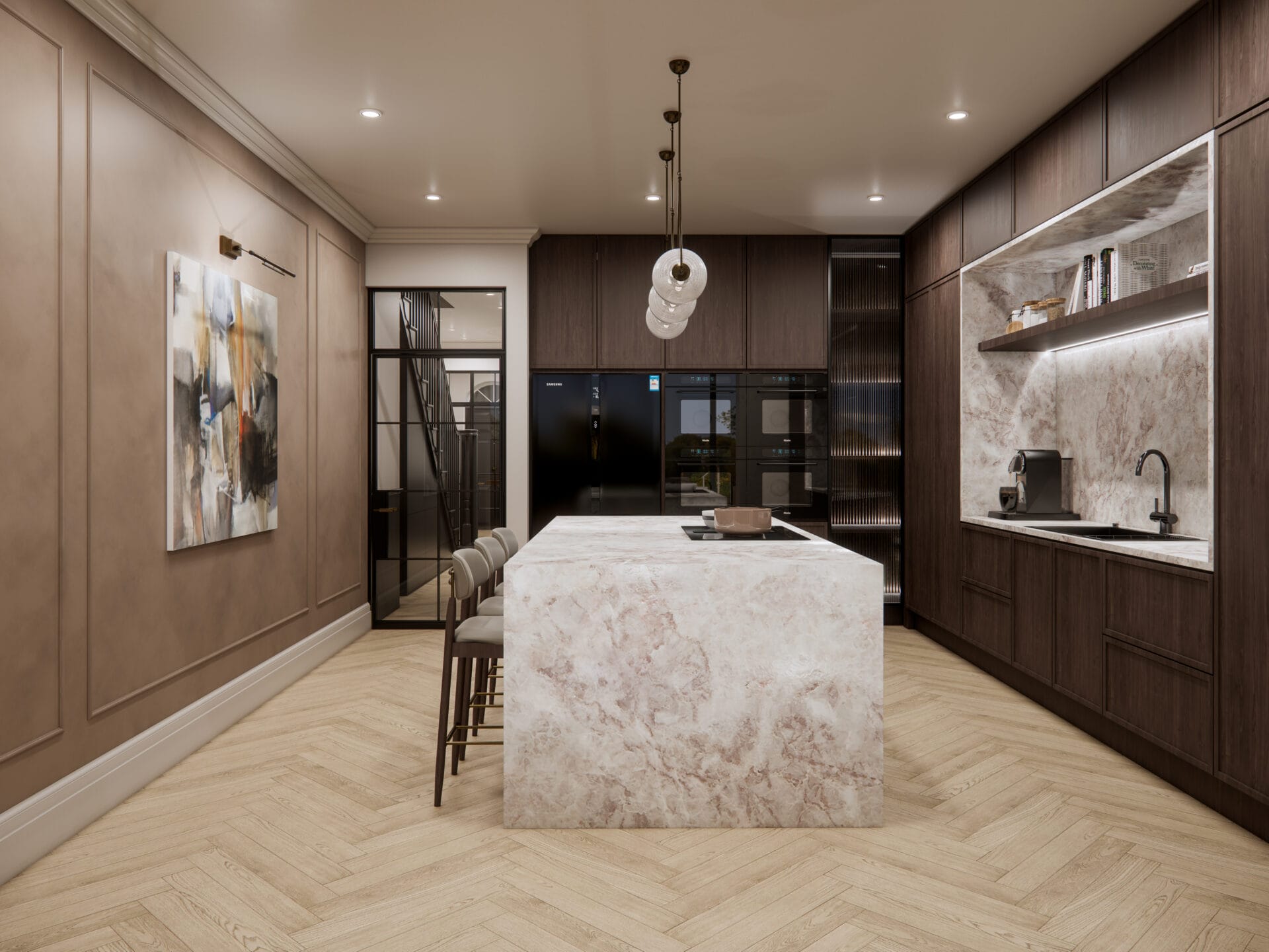 The kitchen itself is anchored by a statement marble island, its veining lending depth and character. Dark cabinetry and integrated appliances contrast with the lighter tones of the island and dining space, creating a harmonious balance of materials. A glass-panelled doorway at the rear provides both definition and flow, ensuring the room feels connected yet considered.